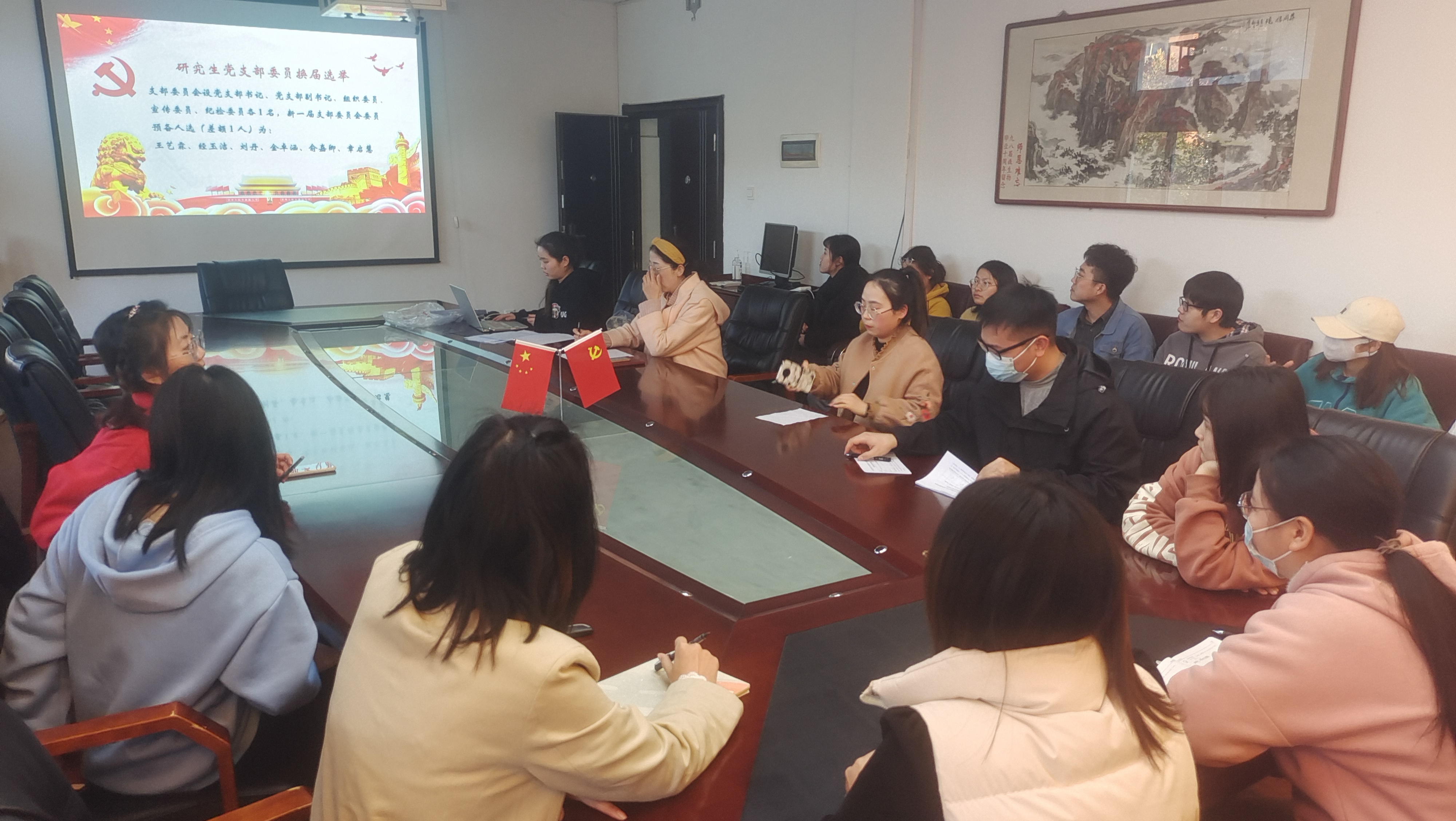 首先支部全体党员起立,奏国际歌。随后会议进行第一项议程,支部副书记经玉洁宣读了选举办法并经酝酿讨论全体一致通过,支部王艺霖对近三年工作进行介绍。依照会议流程,主持人宣布监票、计票人名单,经与会党员表决通过。宣布支部委员正式候选人名单,经与会党员表决通过并发放选票。大会经过无记名投票,监票人和计票人清点查验选票等程序后,通过差额选举最终确定新一届研究生支委会委员名单。