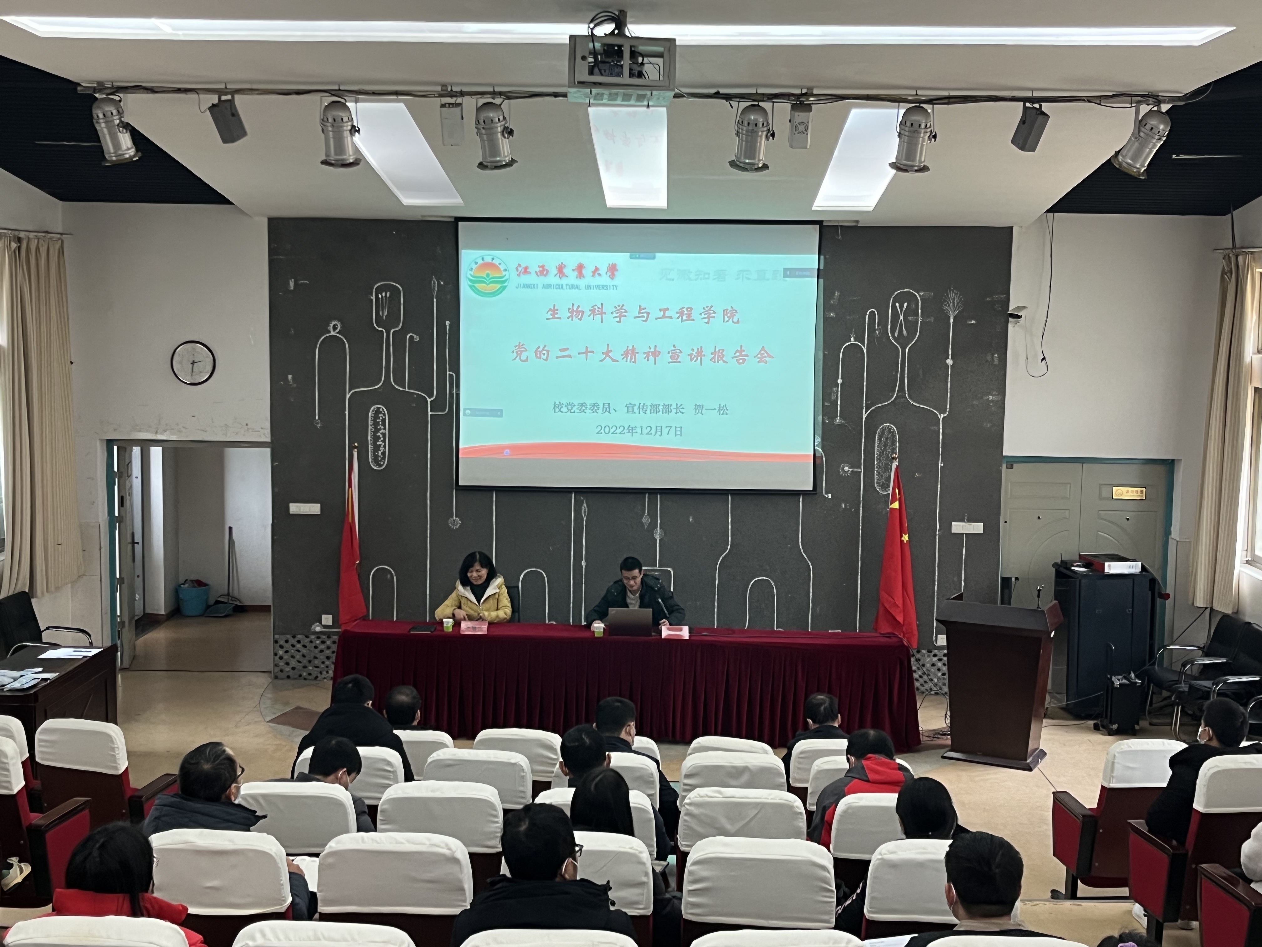 为深入学习贯彻党的二十大精神,12月7日下午,生工学院党委采用线上、线下方式组织开展党的二十大精神宣讲报告会。校“金扁担”宣讲团成员、校党委委员、宣传部部长贺一松作专题报告。报告由院党委书记吴晓玉主持,学院党政领导班子成员、师生党员、部分学生代表参加报告会。