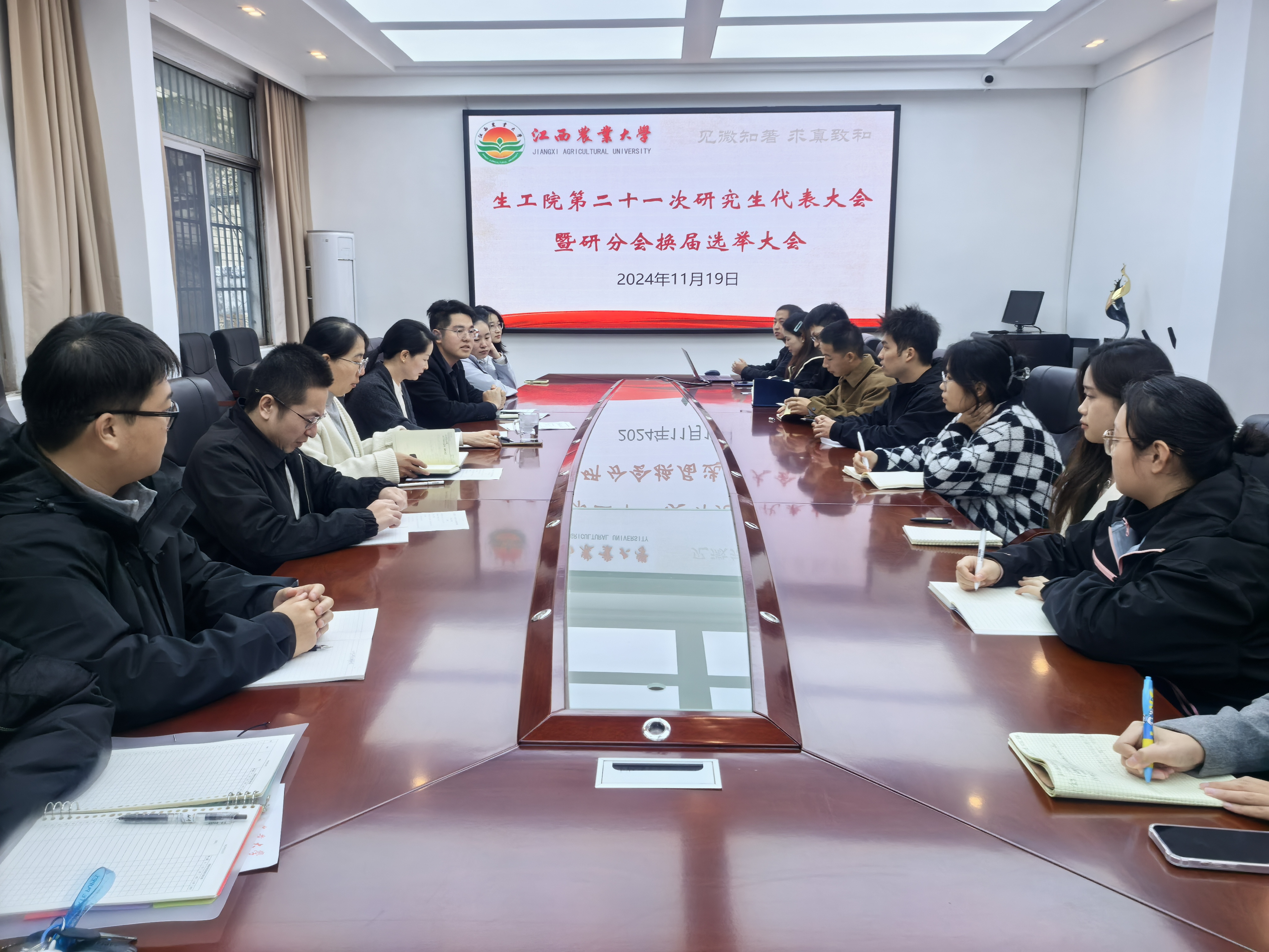2024年11月19日下午,学院召开第二十一次研究生代表大会暨研究生分会换届选举大会,院党委副书记王莲花、学工办老师和全体研究生学生干部参会。