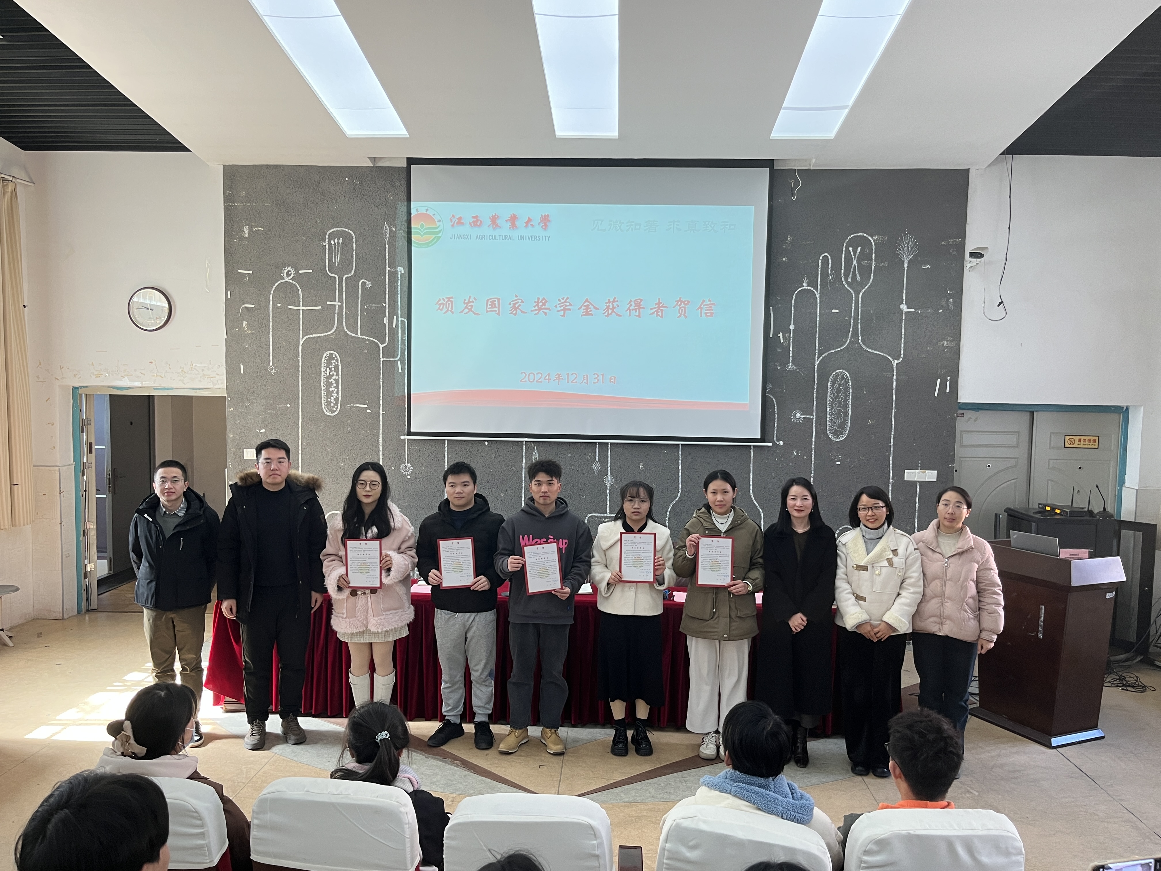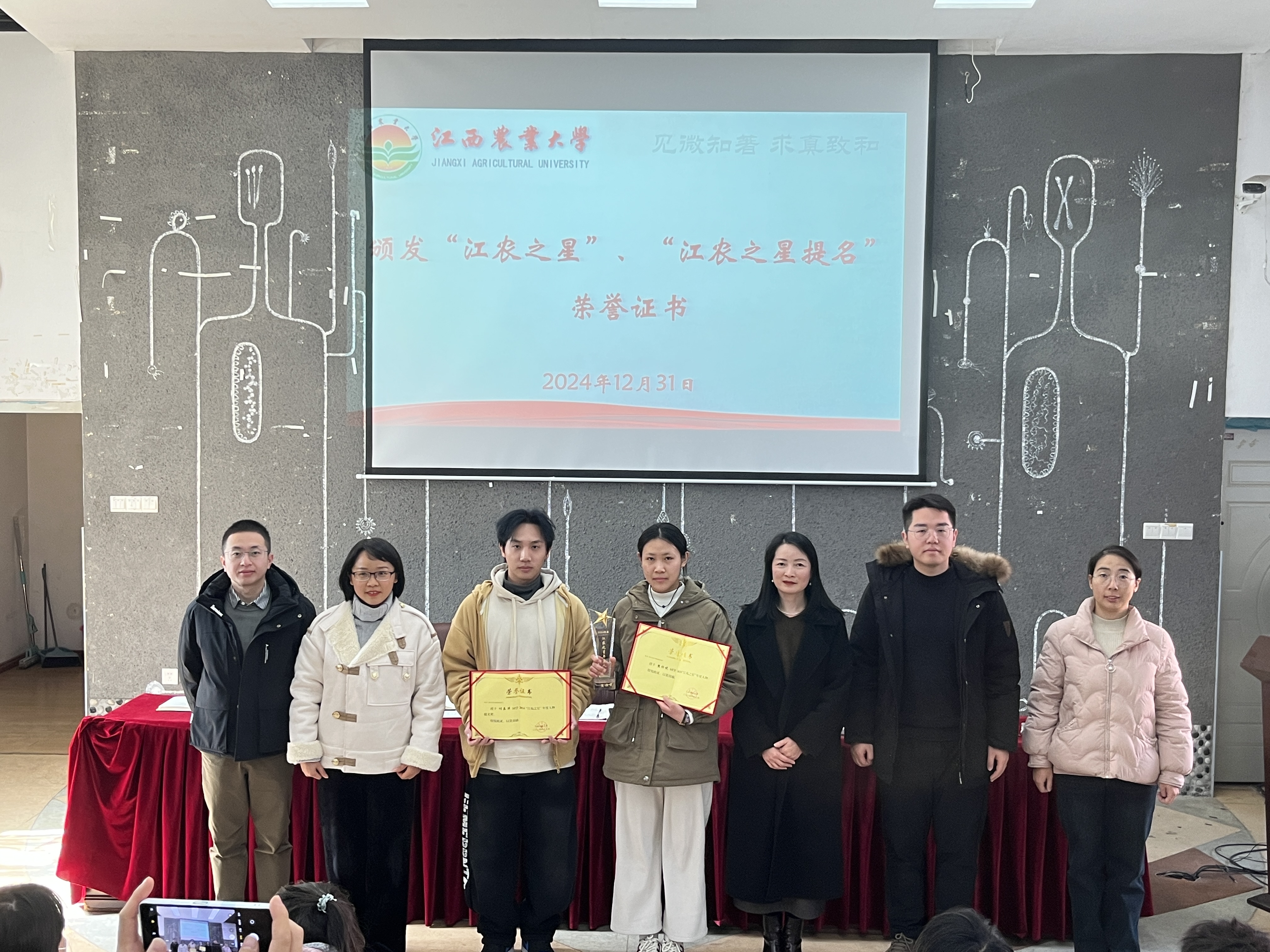 首先,王莲花为熊欣悦、付乐洋分别颁发2024年“江农之星”、“江农之星提名”荣誉证书,辅导员罗强和赵荣分别为2024年研究生国家奖学金获得者和2024年本科生国家奖学金获得者颁发贺信, 希望全院同学以他们为榜样,继续努力,再创佳绩。