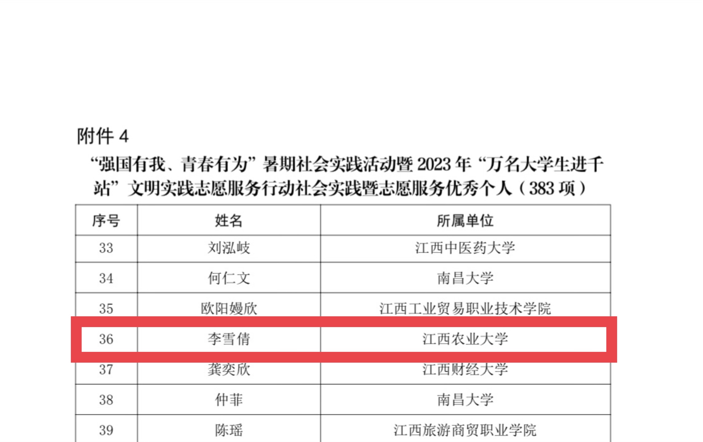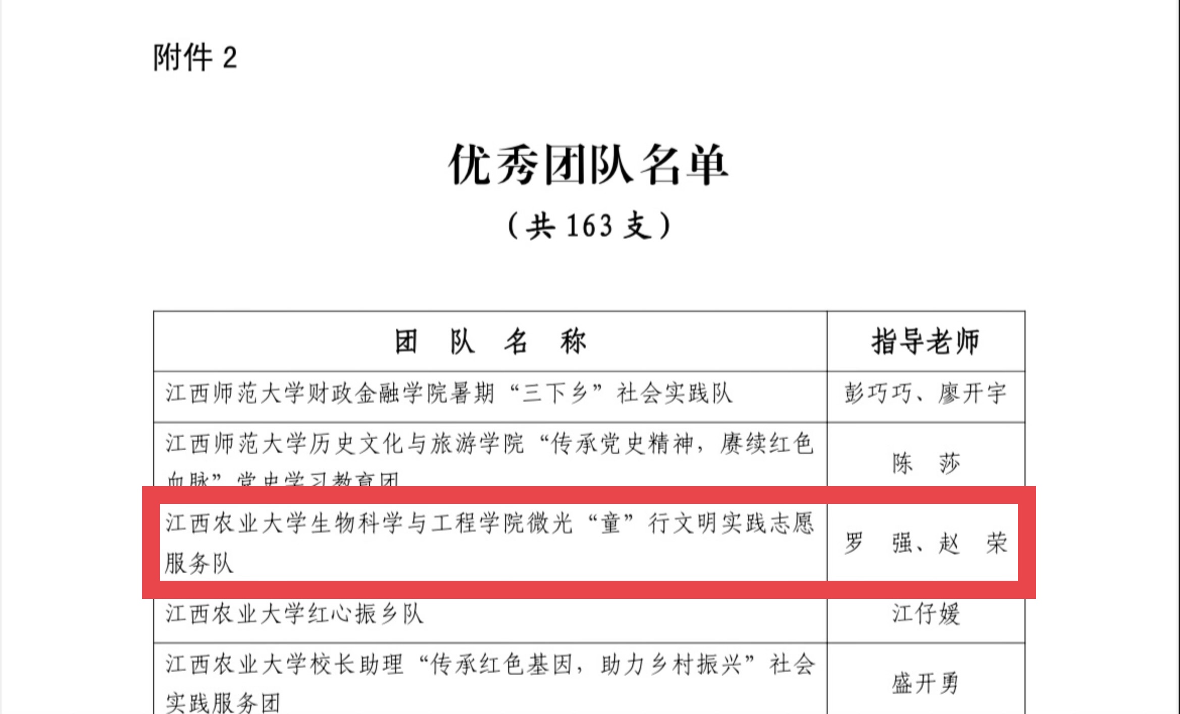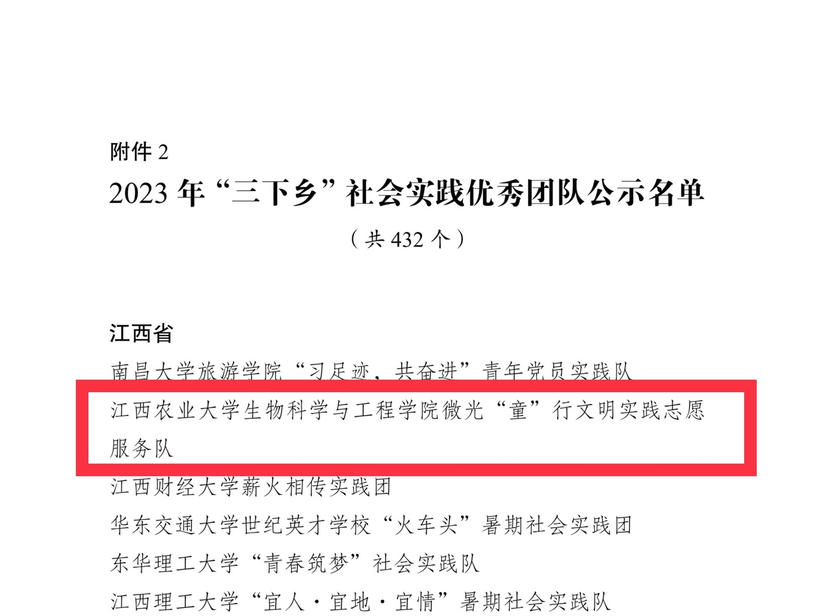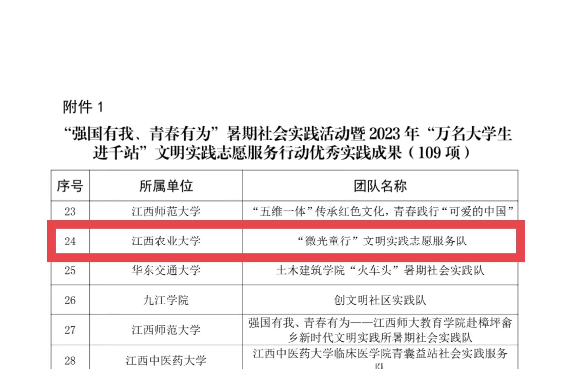 近日,学院“微光‘童’行文明实践志愿服务队”在2023年“三下乡”社会实践活动中脱颖而出喜报频传。先后获得2023年全国大中专学生志愿者暑期文化科技卫生“三下乡”社会实践活动优秀团队;江西省教育厅“强国有我、青春有为”暑期社会实践活动暨2023年“万名大学生进千站”文明实践志愿服务行动优秀实践成果、生技2102班李雪倩获得先进个人;2023 年江西省大中专学生志愿者暑期“三下乡”社会实践活动优秀团队。