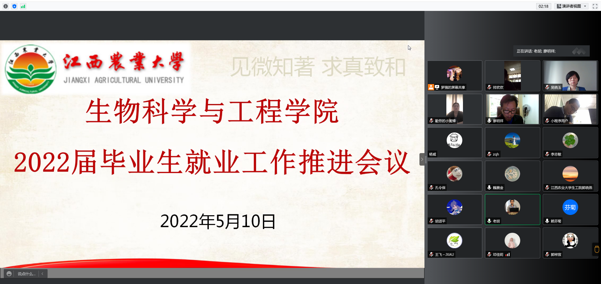 5月10日下午,生工院召开2022届毕业生就业工作腾讯会议。院党政全体领导、各党支部书记、毕业班班主任、学工办全体辅导员参加会议。