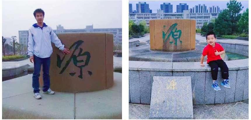 生工081班唐清源校友和其儿子在“生命之源”前的“传承”