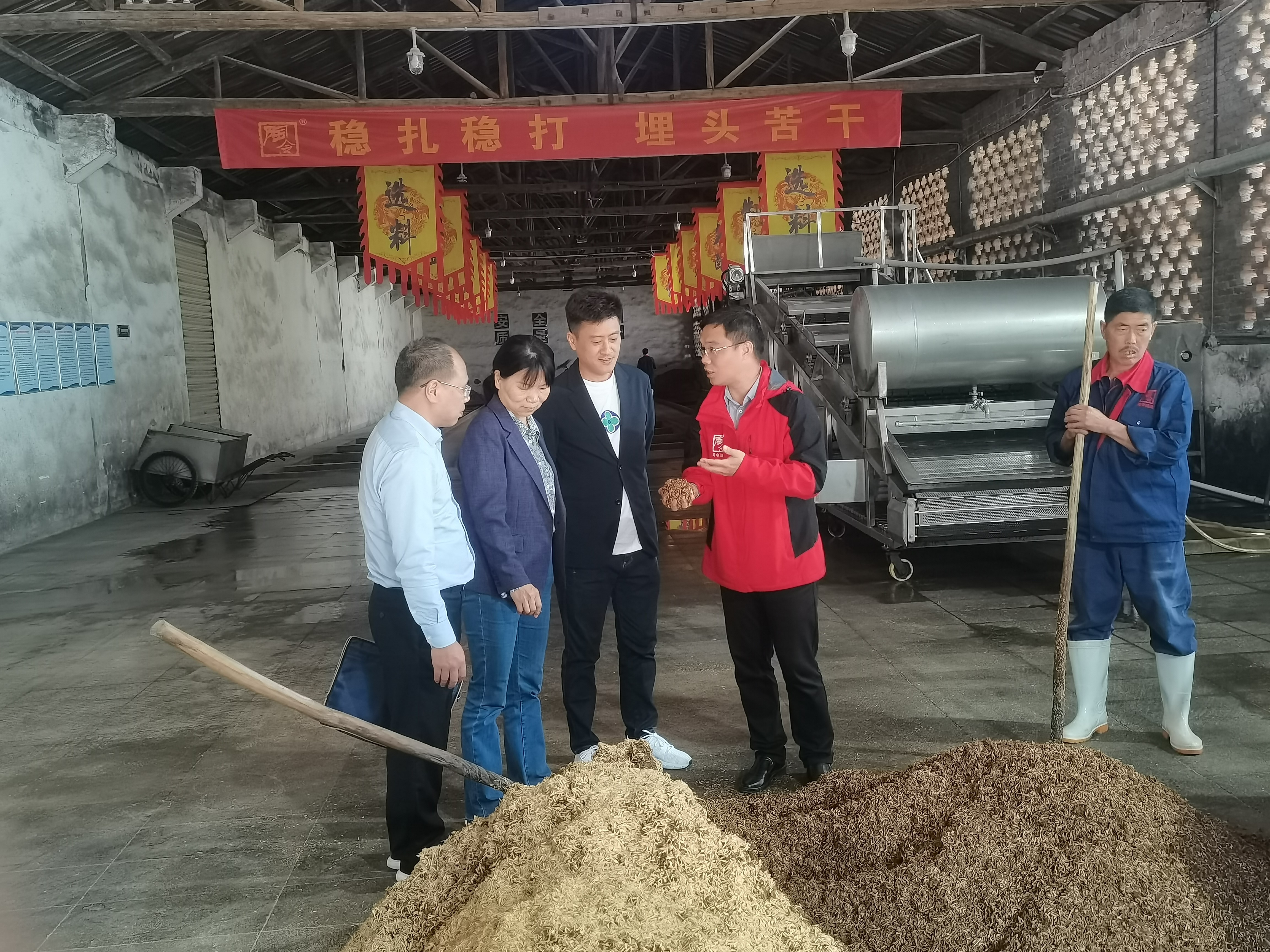 江西陶令酒业有限公司技术负责人、院校友会江西分会副会长黄小晖(我院2005级微生物学专业研究生)陪同参观了窖池、蒸馏车间和窖酒,并就陶令酒的历史渊源、发展情况、酿酒工艺特色和香型特点做了详细介绍。随后大家就酿酒工艺技术改进和香型关键风味物质挖掘等方面进行了深入交流。吴晓玉对校友企业发展取得的成绩表示肯定,希望未来能够与校友企业加强交流合作,同时也勉励校友们继续努力,为社会做出更大贡献。