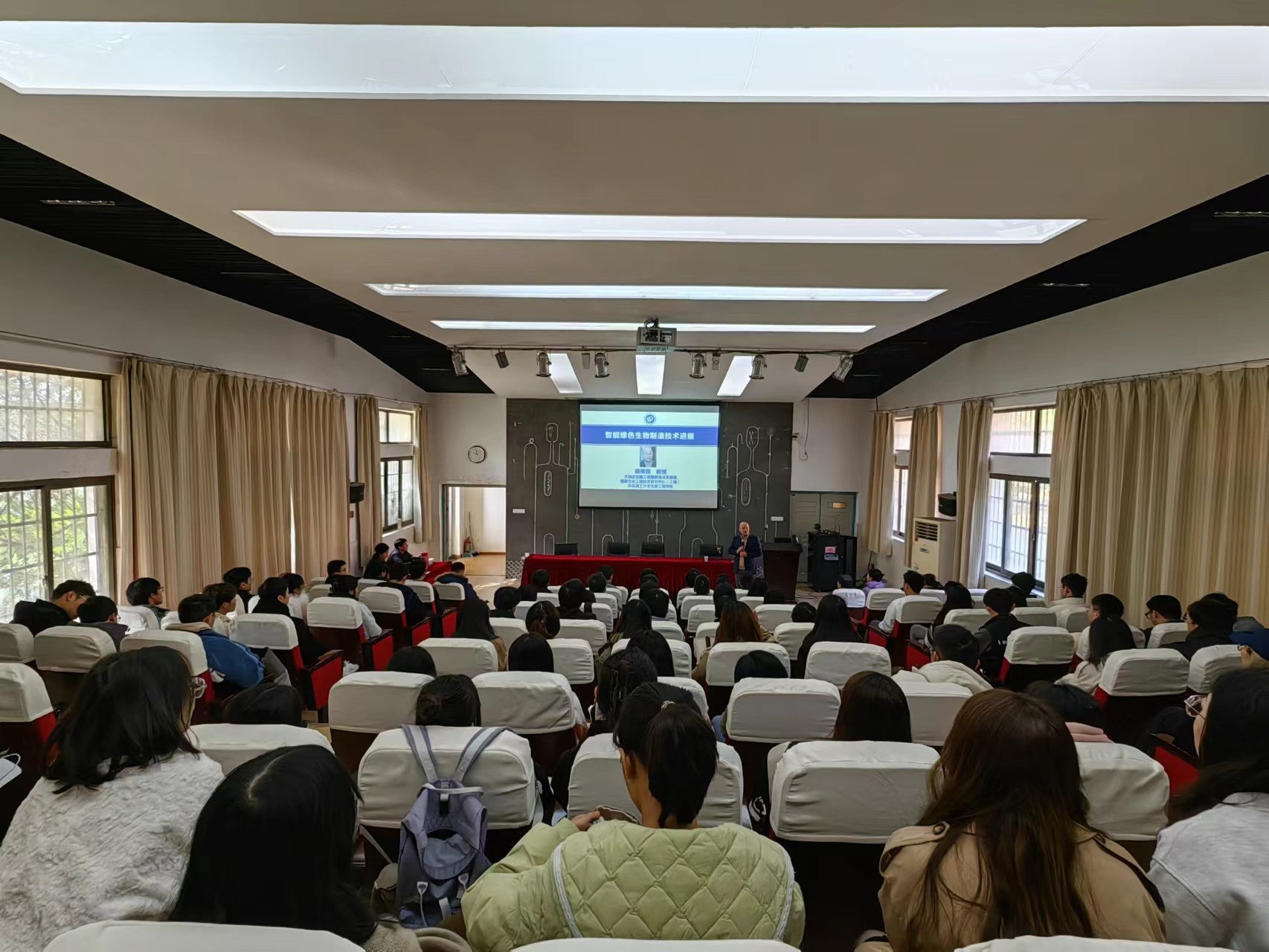 11月17日上午,国家科技进步奖获得者、华东理工大学生物工程学院郭美锦校友应邀到我院进行学术交流,并在生工院一阶报告厅作题为《智能绿色生物制造技术进展》的学术报告。报告由院党委书记吴晓玉主持,100多位师生参加了此次报告。