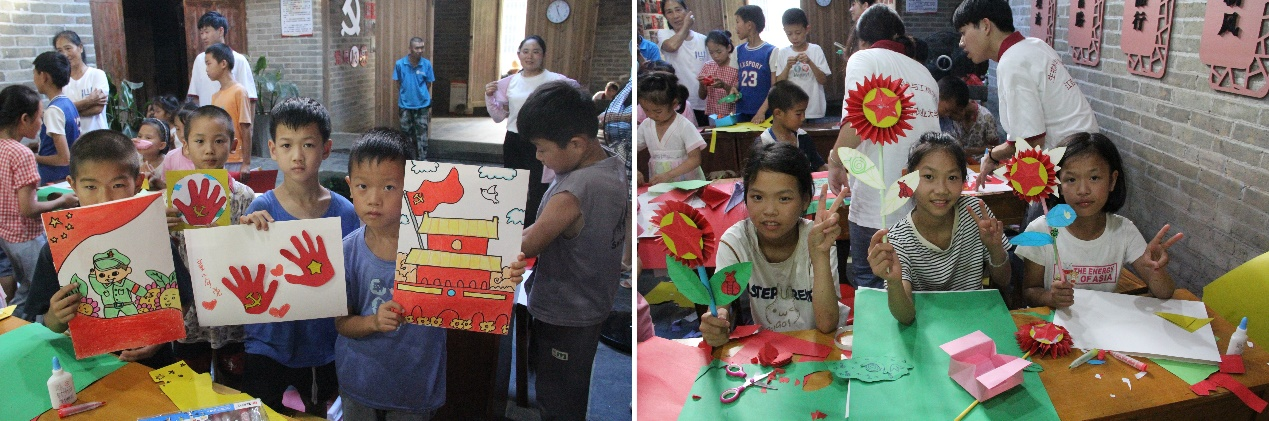 “姐姐,你好漂亮!去年那个宏宇姐姐、蔡蔡哥哥还会来给我们上课吗?……”随着孩子们的疑问,队员们以“眼疾手快”、“听口令”等破冰游戏拉近了与孩子们的距离,并开展了红色教育主题课程,带领孩子们用彩色卡纸制作红军长征途中的帽子、衣服、鞋子等,用油画棒画出了五星红旗、中国共产党党旗,志愿者们声情并茂的讲述了伟大的中国共产党历史,带领孩子们唱响了《没有共产党就没有新中国》,并集体朗诵《可爱的中国》。这一系列课程从“一点红”发展到“一片红”切实将红色文化教育融入杨梅村小学课堂。
