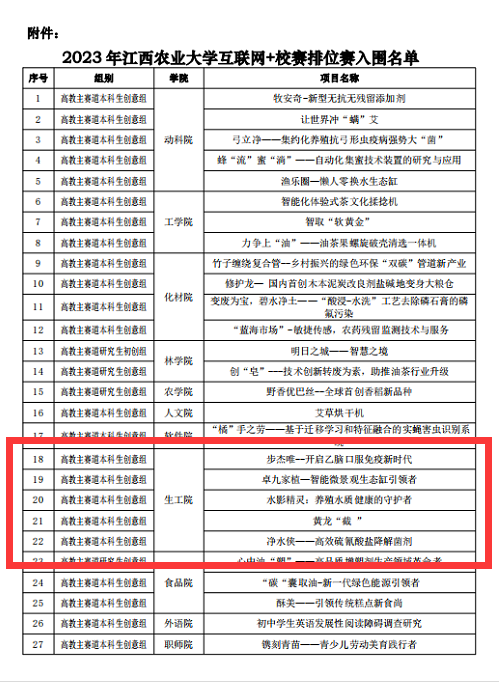 近日,学校发布了入围学校第九届“互联网+”大学生创新创业大赛决赛(排位赛)的项目名单,经学院初赛、校赛网评,全校共遴选出50个项目晋级校赛决赛排位赛(27个“高教组主赛道”项目,23个“青年红色筑梦之旅赛道”项目)。其中,我院7个项目成功入围,入围项目总数位列全校第二,这是我院入围学校互联网+大学生创新创业大赛项目总数上的又一次突破。