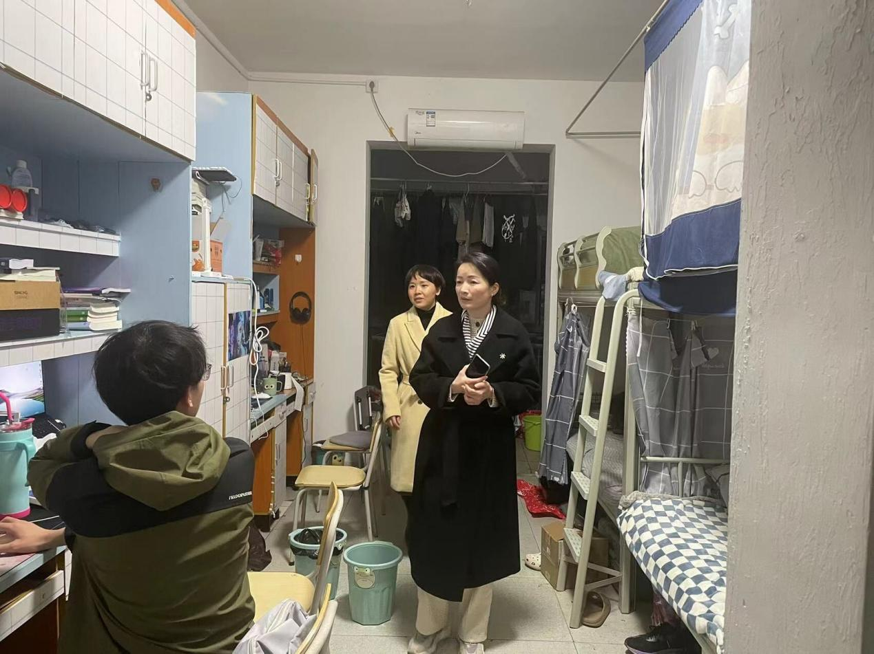 随后,一行来到南区学生宿舍看望了学生,关心了解了同学们的宿舍生活现状,同时对宿舍设施、卫生、消防以及周边电动车停放等进行了详细了解,并向同学们强调了电动车充电等各类安全注意事项,嘱咐大家养成良好的文明行为,共同营造良好学习生活环境。