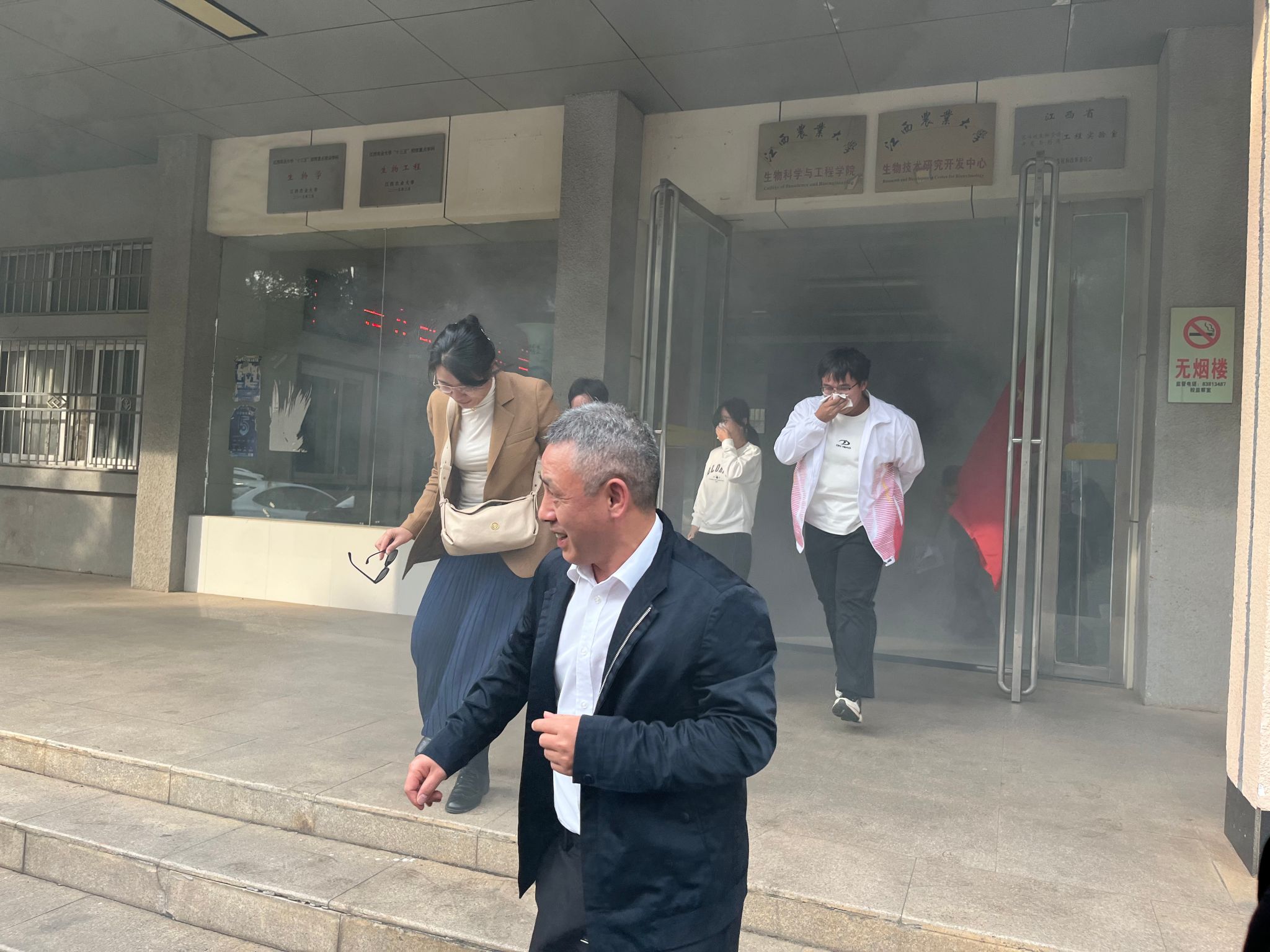 随着警报声响起,消防应急演练正式开始,师生们迅速反应,用毛巾等捂住口鼻,弯腰低姿,按照预定的疏散路线有序撤离到安全地带,整个疏散过程紧张而有序。