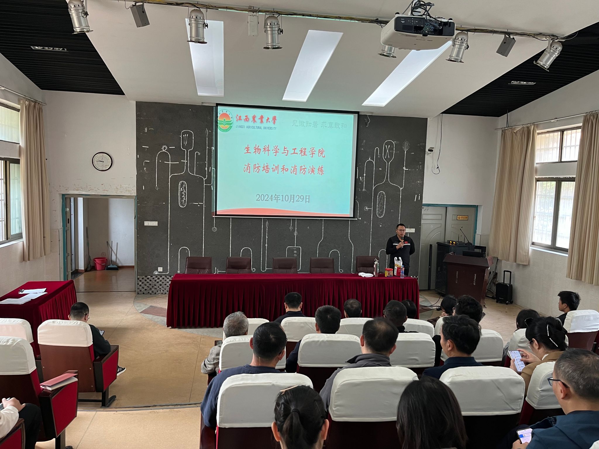 在培训环节,徐杰结合近年来的火灾典型案例,从火灾起因、电气火灾特征、火灾预防、安全逃生、实验室安全以及学生宿舍安全防范等方面,进行了细致的讲解,给大家上了一堂生动的消防安全课。同时,详细讲解和演示了灭火器和防毒面具等消防器材的使用。