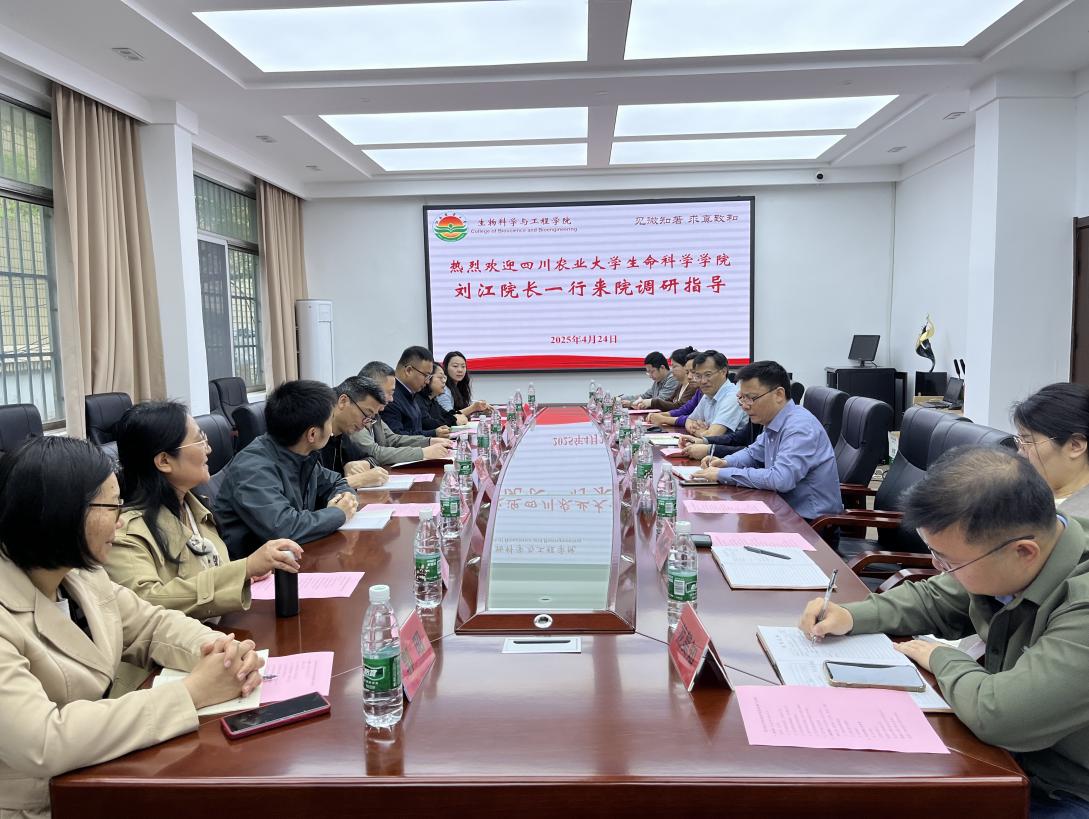 4月24日上午,四川农业大学生命科学学院院长刘江率副院长刘贺贺等一行6人来我院开展调研交流。交流座谈会在学院会议室举行,由院长王义华主持,党委书记张庆华、党委委员孔令保及各科室负责人、生物工程教研室教师代表参加座谈。