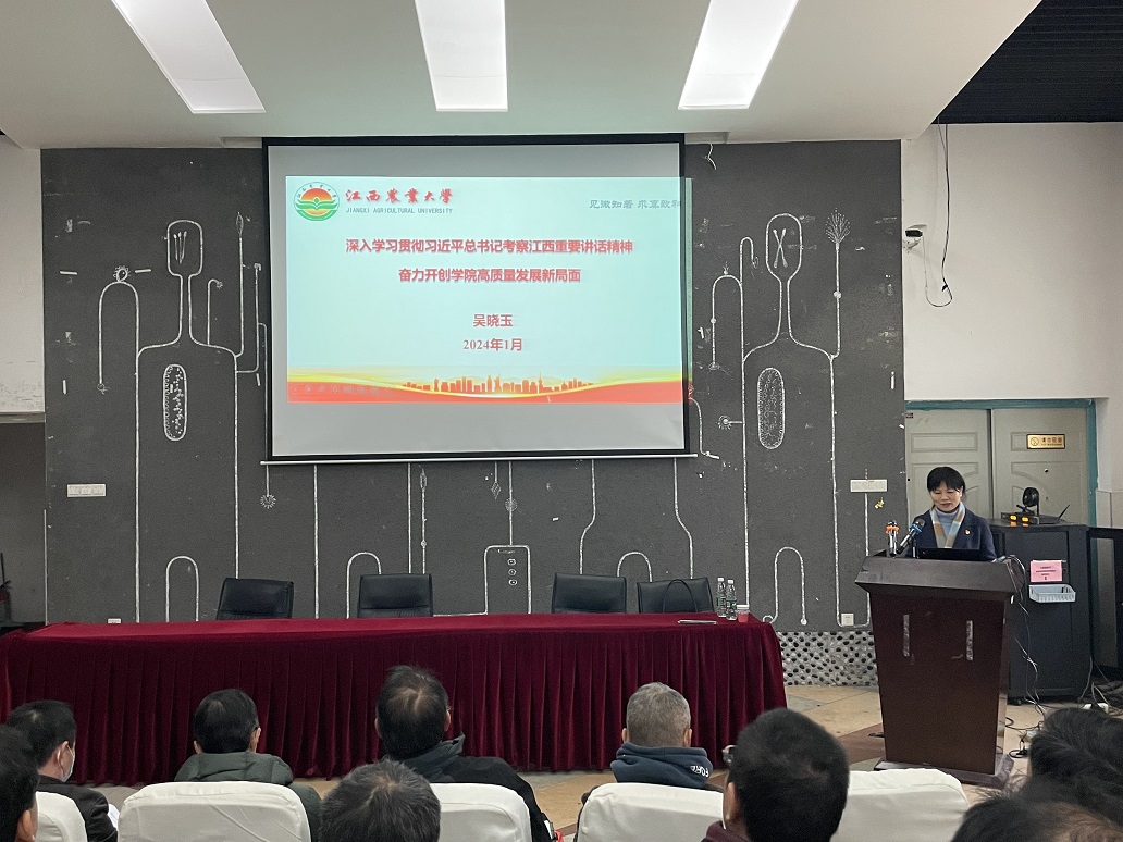 吴晓玉回顾了习近平总书记三次考察江西的历程,重点讲解了第三次考察江西的重要讲话精神,强调了我们要深刻把握习近平总书记再次考察江西的重大意义,全面落实习近平总书记对江西发展提出的任务要求。结合学院实际,提出要坚定不移把习近平总书记考察江西重要讲话精神落到实处,一要继承红色基因,铸牢理想信念;二要以立德树人为根本,服务学生成长成才;三要以强农兴农为己任,助力乡村振兴;四要发挥学院优势,融入江西发展大局。