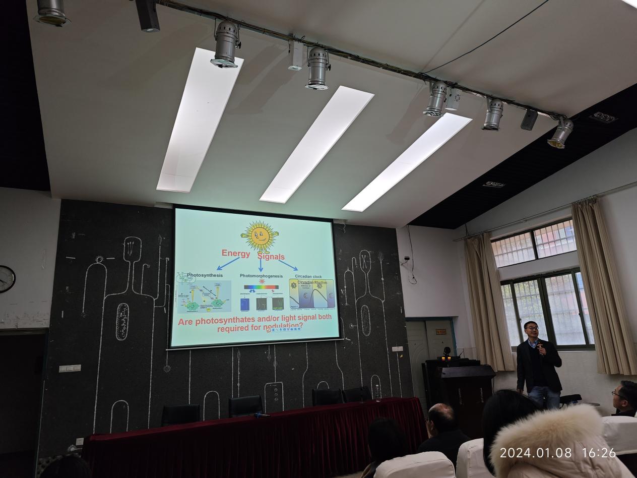 王学路教授团队长期关注光合产物和光信号调控和共生固氮的机制。该团队主要以豆科植物和拟南芥为研究系统,研究作物碳氮平衡,生物固氮和菌植互作调控机制,植物激素信号转导网络及其调控生长发育的机制研究。讲座上,王学路教授主要介绍了其团队2021年和2022年发表在Science上的研究成果,他们的研究揭示了光信号调控根瘤形成的机制以及大豆根瘤能量状态调控共生固氮的新机制。