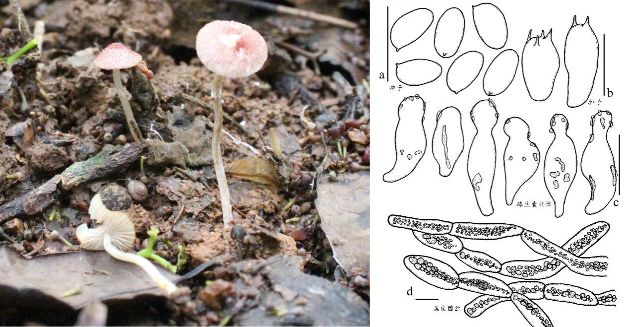 该物种的发现及命名人为我院教师颜俊清博士。据颜老师介绍,红鳞小蘑菇最显著的识别特征是子实体很小,菌盖直径仅1cm,菌盖上具有粉红色的鳞片,菌柄白色,近上部具有膜质菌环。小蘑菇属里像红鳞小蘑菇这样,子实体小,菌盖上具有粉红色鳞片的种非常少,仅有3个分布于东南亚的种与之类似,但是他们之间的微观结构,如孢子,缘生囊状体的差异很大。