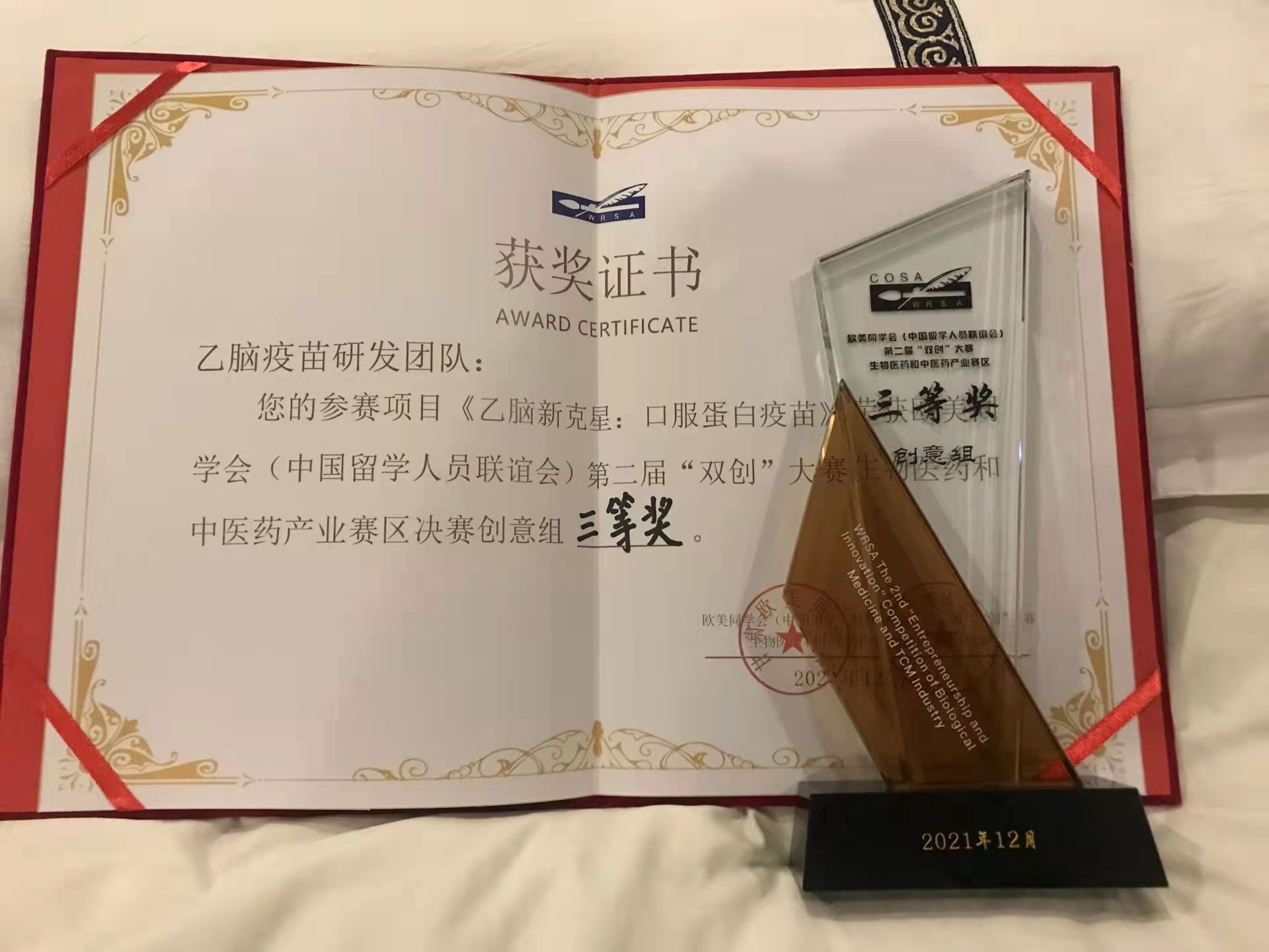 2021年12月19日,欧美同学会(中国留学人员联谊会)第二届“双创”大赛生物医药和中医药赛区决赛评选结果揭晓。我院孔令保教授团队申报的项目“乙脑新克星:口服蛋白疫苗”喜获创意组三等奖,项目组成员包括教师李莎、王婷、王宇、辛秀和李逸寒,梅岭学者讲座教授王晓玲,校外创新创业导师高博,研究生翁诗琦,王全胜,万加武和徐晶,本科生陶飞飞。本次获奖是我省留学人员首次在生物医药赛区入围初赛并在决赛中获奖。经过国内外海选,30个项目入围生物医药和中医药赛区创意组初赛。初赛淘汰一半项目,剩余一半项目入围决赛。决赛产生一等奖3名,二等奖4名,三等奖5名,优秀奖3名。甘肃省委常委、省委统战部长马廷礼,甘肃省副省长张世珍,甘肃省人民政府副秘书长王晓阳,中国工程院院士、甘肃欧美同学会名誉会长王锐出席颁奖仪式并为获奖者颁奖。颁奖仪式结束后,本项目团队与欧美同学会西北(兰州)海创中心签订了意向性协议。
