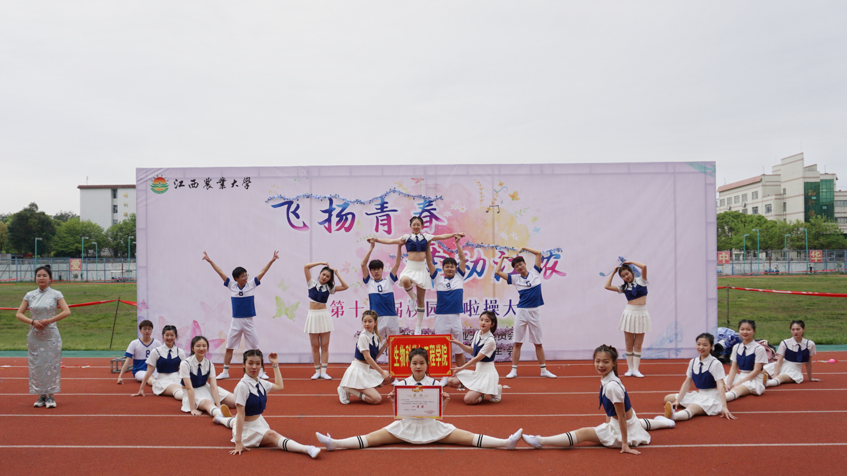 为展示我校青年学子积极向上的精神面貌,提高学生身体素质,丰富校园文化生活,4月10日下午,由校团委主办、校学生会承办的“飞扬青春,舞动江农”第十三届校园啦啦操大赛在北区田径场顺利进行,全校共14个学院参加。经过激烈角逐,我院参赛队披荆斩棘,夺得比赛一等奖。