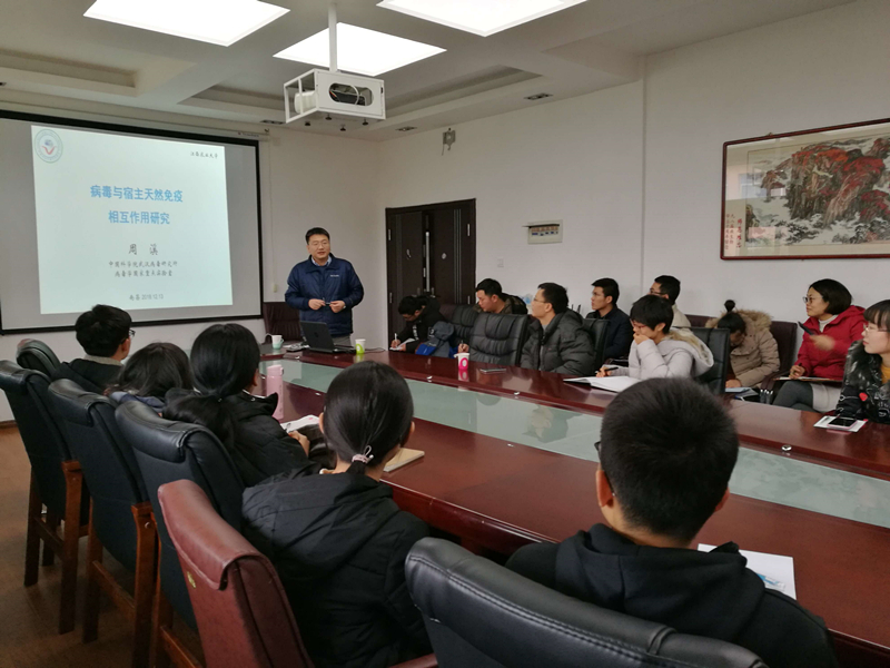 12月13日下午,中科院武汉病毒所病毒学国家重点实验室副主任、国家优青、863计划青年科学家周溪研究员应邀来校进行学术交流,为我院和动科院的师生做了题为《病毒与宿主天然免疫相互作用研究》的报告,讲座由病原微生物研究所负责人主持。