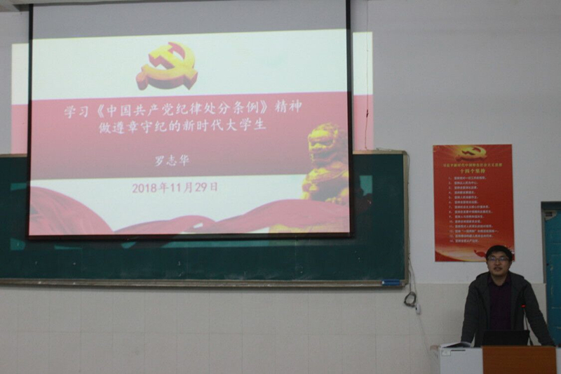 学院大学生党建办于2018年11月29日晚,在院办二阶开展了一堂针对党员与入党积极分子的党课学习,院党委副书记罗志华细致讲解了《中国共产党纪律处分条例》,教导每一名同学做遵章守纪的新时代大学生。