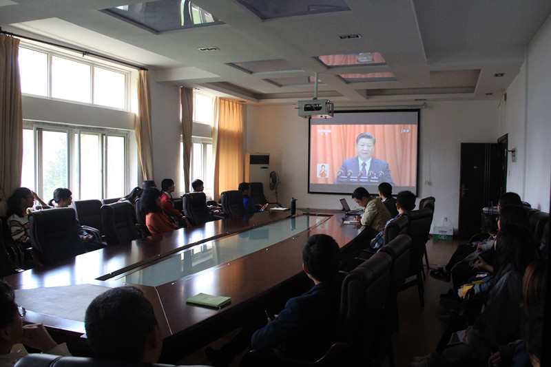中国共产党第十九次全国代表大会于2017年10月18日上午九时在人民大会堂隆重召开。党的十九大,是在全面建成小康社会决胜阶段、中国特色社会主义发展关键时期召开的一次十分重要的大会。大会确立的主题是:不忘初心,牢记使命,高举中国特色社会主义伟大旗帜,决胜全面建成小康社会,夺取新时代中国特色社会主义伟大胜利,为实现中华民族伟大复兴的中国梦不懈奋斗。为及时学习宣传党的十九大精神,学院党委在院办二楼会议室组织全员没课的师生党员集体收看开幕式,大学生党员也以自己的方式寄语盛会,表达决心。