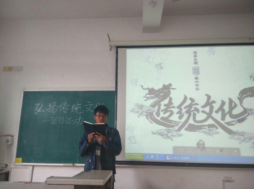 4月13日,生工1401团支部举办了“弘扬传统文化”文艺汇演主题团日活动,班级同学以寝室为单位通过唱红歌弘扬革命精神,诵经典、咏国学传承传统文化。活动激发了青年对祖国、传统文化的热爱,增强民族自尊心和自信心