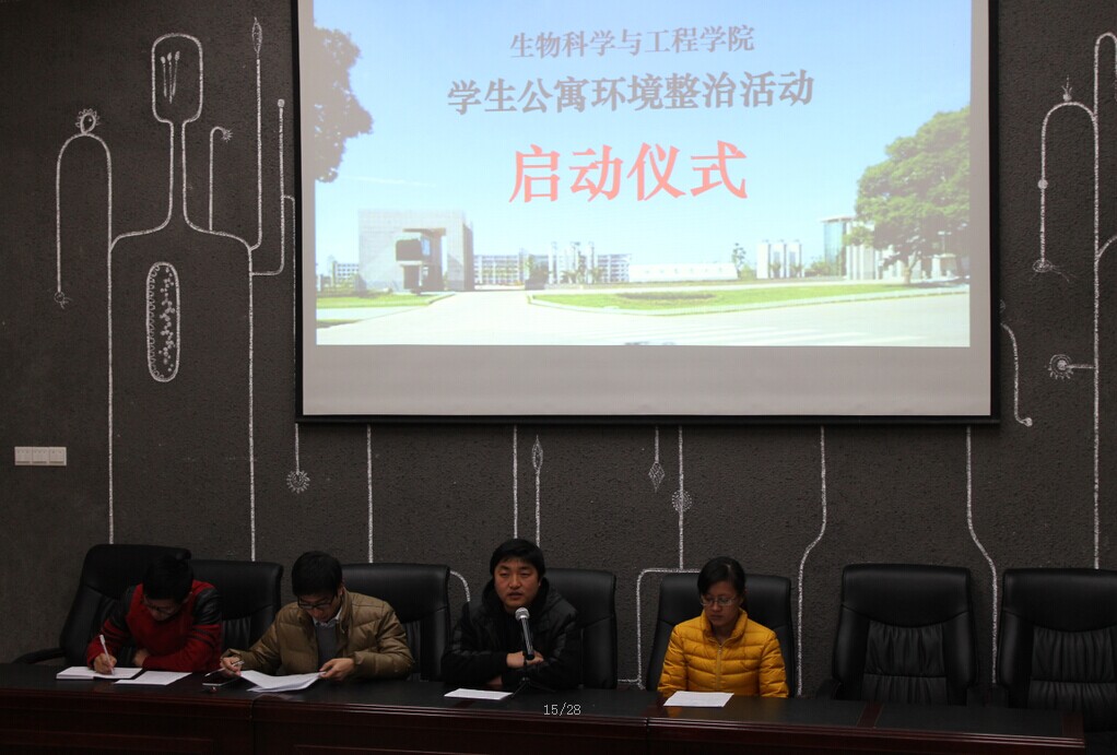12月4日晚在生工院一阶举行了学生公寓环境整治工作启动仪式。学院所有学生组织包括团委学生会、学生党建办、学生公寓管理委员会、各班班长团支书、青年志愿者协会、生物技术协会、海欧社会调查协会共100多位学生干部参加了启动仪式。此次公寓环境整治活动规模空前,专门成立了生工院学生公寓环境整治工作小组,由院党委副书记罗志华书记任组长,下设工作办公室。整治活动主要分三个内容:卫生环境整治、生活环境整治和学习环境整治。活动将自12月持续到明年3月,要求达到卫生环境整治有序、生活环境和谐有爱、学习环境严谨有效。