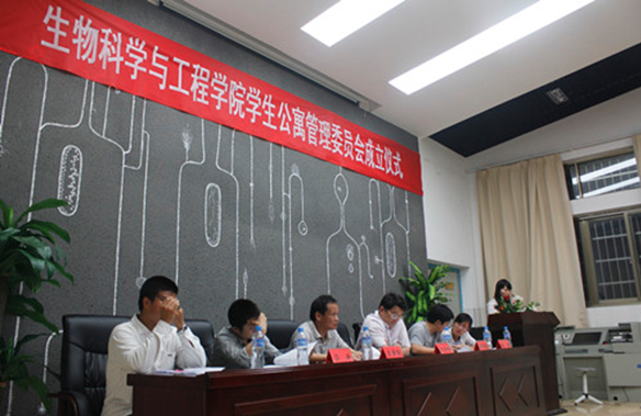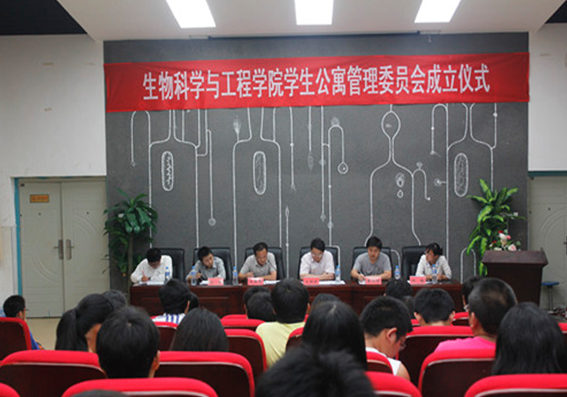 2012年6月6日晚七点,生工院学生公寓管理委员会成立仪式在生工楼一阶隆重举行。我校学工部部长、学工处处长左辉群,校后勤集团副经理王军华,我院党委副书记罗志华、团委书记江冰、团委辅导员刘柳、学生公寓管理委员会秘书长方绍明应邀担任会议嘉宾,来自生工院各年级的学生公寓管理委员、班长、寝室长等近一百余人参加了大会,罗书记主持此次会议。
