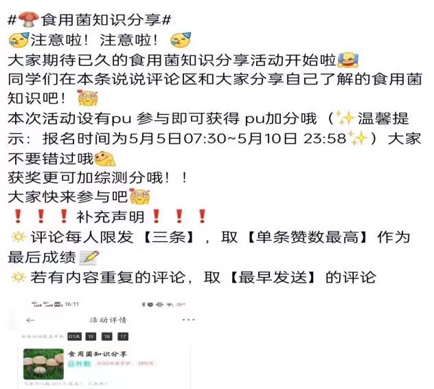 活动发挥互联网优势,采取线上开展,活动期间同学们踊跃报名、积极参与,在评论区留下了各自的专业知识见闻——举例论述菌类本身有无毒素和其颜色是否鲜艳的相关性;对食用菌的科属、数目、效用的涵盖;包括对具体个别菌种的描述,如云南知名度和药用价值双高的野蘑菇—鸡枞,还有常用于涮锅和配菜的金针菇,嫩滑爽口、味道鲜美的草菇等。活动还按评论区参与者获赞数由高到低评选出获奖学生,其中,温丽同学荣获一等奖;张宁、李明两位同学获二等奖;江一娜、王维、黄新霖同学获三等奖;宋若星、鲍牧川同学荣获优胜奖。