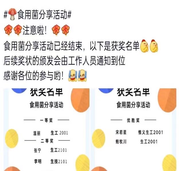 通过此次食用菌知识分享活动不仅丰富了同学们的专业知识存,还加强了同学们之间探讨学术的桥梁,充分体现生工学子抗疫期间也不放松学业,保持积极学习状态和乐观向上的精神。学海无涯而意兴盎然,希望这种线上知识分享成为一种学生学术专业交流的新起点,让知识分享成为学子探讨学术的新路径。