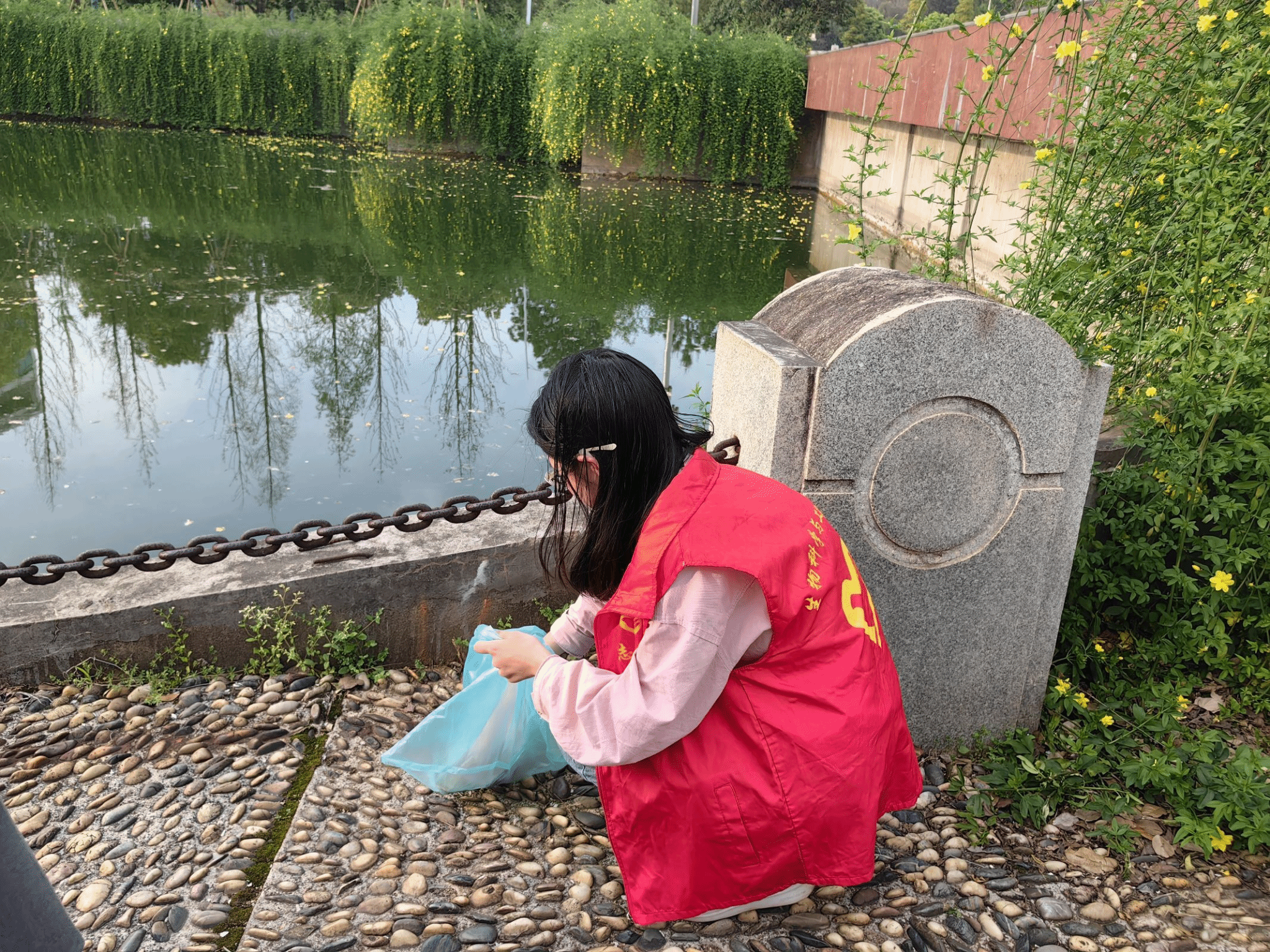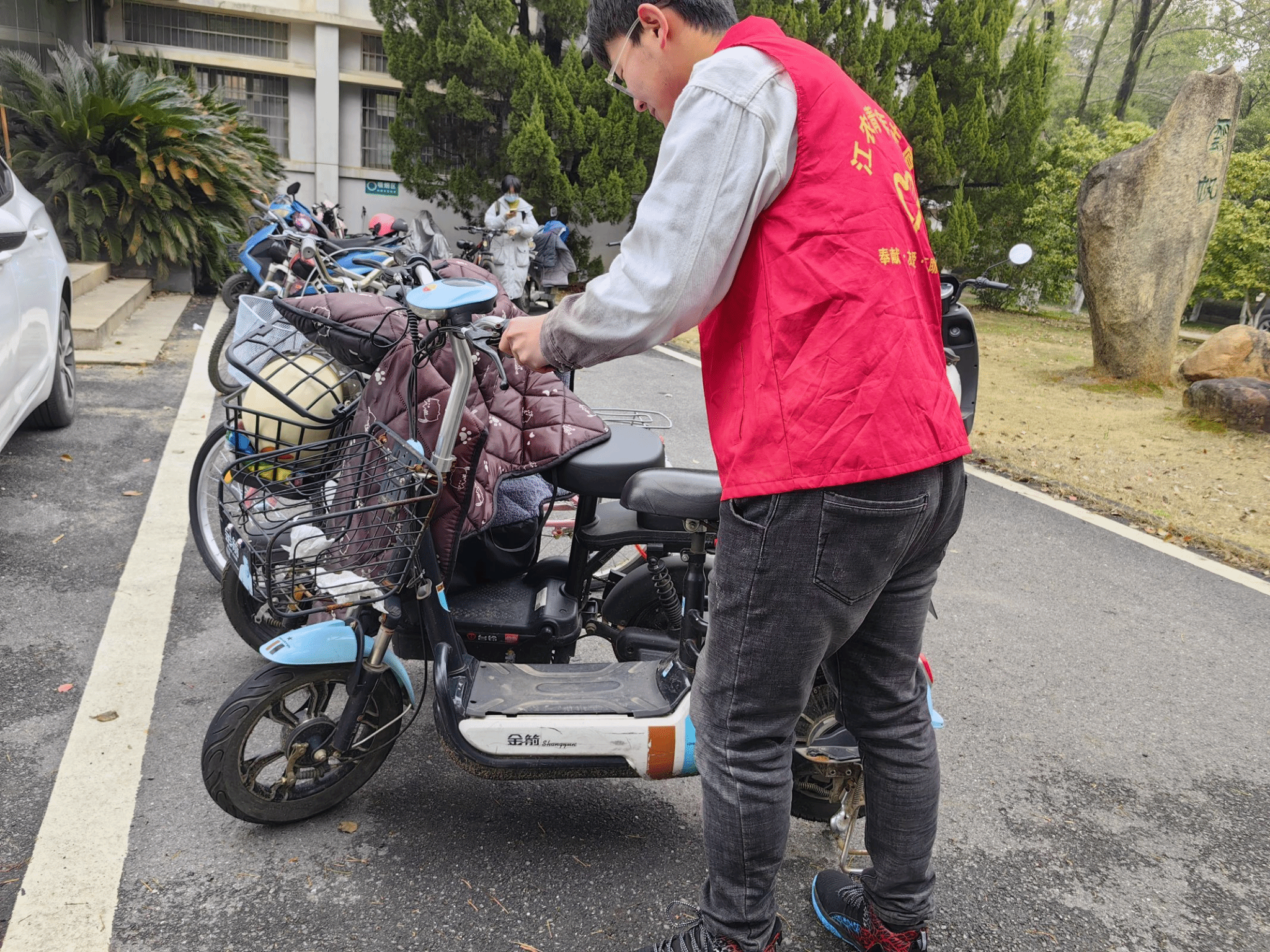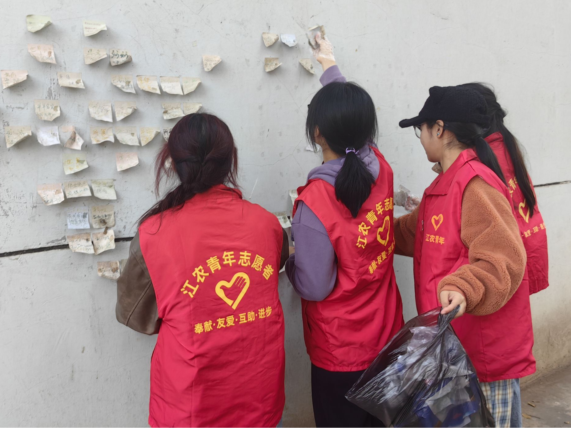 守护校园净土,共筑文明风尚。生工院志愿者以青春之名,为校园文明增色添彩。在停车区域,他们俯身扶正歪斜的单车,规范非机动车停放,让校园交通井然有序;在湖泊岸畔,他们手持工具,沿着湖岸仔细清理垃圾,守护水清岸绿;在宿舍楼下,他们耐心劝阻不文明行为,维护环境整洁,营造互助友爱的氛围。志愿者的身影与校园美景交相辉映,文明之花在校园的每个角落悄然绽放,为校园增添了一抹亮丽的色彩。
